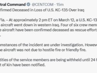 当地时间3月13日,美国中央司令部表示,一架在伊拉克西部坠毁的美国KC-135空中加油机上的6名机组人员已全部确认死亡。