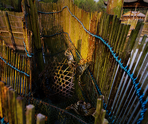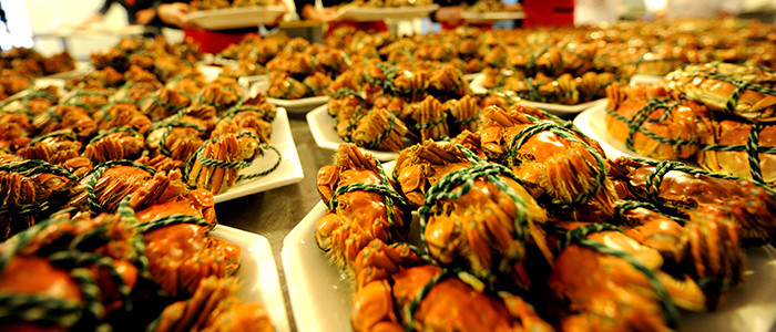 每年中秋前后,客居溱湖的螃蟹又开始回游,返回“娘家”——长江入海口交配产卵。但麻烦来了,回游的螃蟹,一碰上簖,便纷纷改道向两边高处爬去,翻过簖后一只只落在篾篓之中——只有那些翻过簖的螃蟹,才叫簖蟹——如果不是体肥肉壮的大蟹,根本无力爬上那高高的簖,所以簖蟹中,绝没有小的、瘦的、病的,个个膘肥体壮,力大无穷,足有半斤。于是自古以来便有“南有澄湖闸蟹,北有溱湖簖蟹”,人称“南闸北簖”。