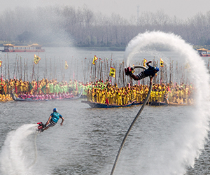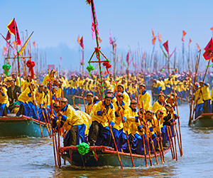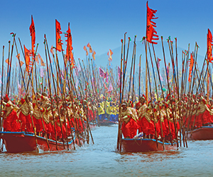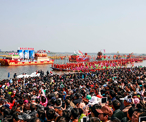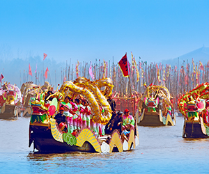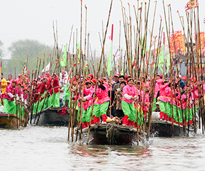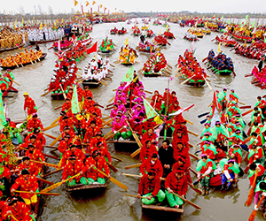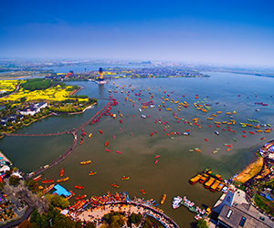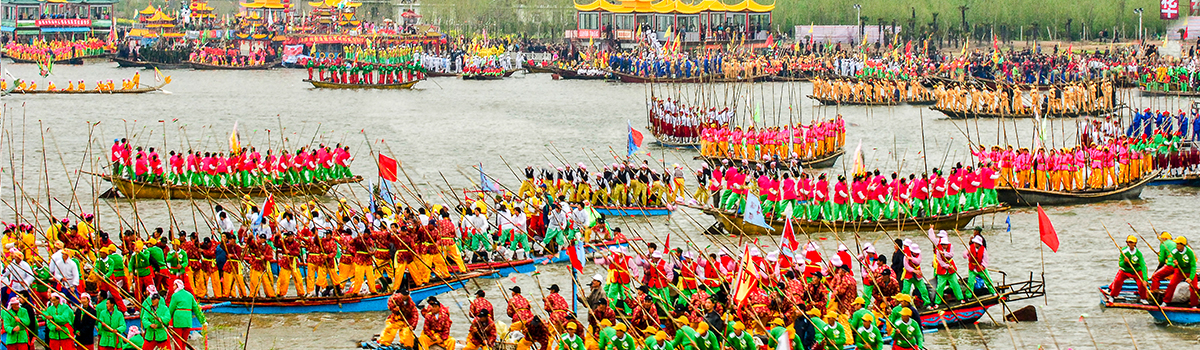 溱潼会船节是一种古老的汉族民俗活动。源于宋代。相传山东义民张荣、贾虎曾于溱潼村阻击金兵,溱潼百姓助葬阵亡将士,并于每年清明节撑篙子船,争先扫墓,祭奠英魂,久而久之,形成撑会船的习俗。溱潼会船主要分布在里下河水乡,纵横数百平方公里。会船通常分为篙船、划船、花船、贡船、拐妇船等五种类型,寄寓了汉族民众的美好愿望和祈盼,期盼国泰民安、生活富裕、人世昌隆、人寿年丰。溱潼会船节一年一度,日起在清明节的第二天,被国家旅游局定名为中国溱潼会船节。属于国家级非物质文化遗产。国家重点旅游项目。