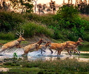 截止2014年园内有湿地野生植物153种,鸟类:共97种,国家一级保护动物有白鹳、黑鹳、丹顶鹤等7种,省级保护动物有鸿雁、鹌鹑、喜鹊、灰喜鹊、画眉等8种。兽类:共21种,国家一级保护动物有麋鹿,省级保护动物有刺猬、猪獾、貉、豹猫、黄鼬等。两栖爬行类:共23种,有金浅侧褶蛙、黑斑侧褶蛙、乌龟、蝮蛇等。鱼类:共38种,此外还有河虾、河蟹、甲鱼、河蚌、田螺、螺蛳、蚬等。其它动物:有浮游动物21属(种),其中原生动物3属,轮虫4属,棱角类5属(种),桡足类5属,底栖动物27属,昆虫10属。