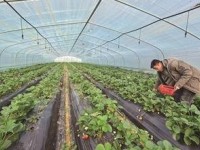 穿过色彩鲜亮的基地门牌,车辆缓缓驶入园区,150余个错落排列的草莓大棚极为壮观。