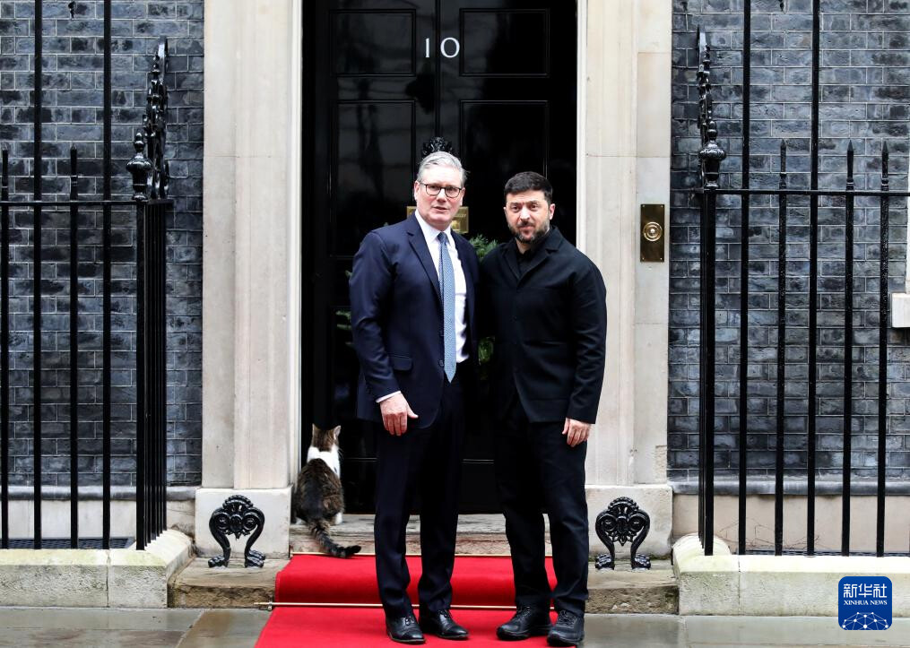 12月8日,在英国伦敦唐宁街10号首相府前,英国首相斯塔默(左)与乌克兰总统泽连斯基合影。英国首相斯塔默8日在首相府唐宁街10号同乌克兰总统泽连斯基、法...
