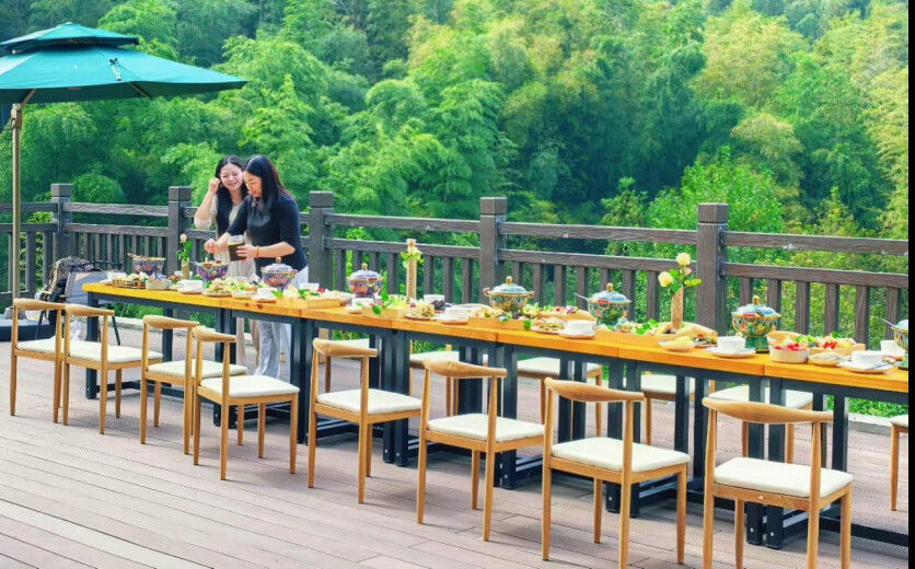 庐江白云茶舍被千亩茶山环抱,白墙黛瓦隐于青翠之间,主打50人以内的茶养团建,特色的“茶汤素食火锅”吸引着游客的味蕾。火锅用山泉水烹煮本地云雾茶,待茶香四溢时加入鲜笋、菌菇、山野菜等食材,滚烫的茶汤翻滚间,既有山林的清鲜,又有团聚的温情。民俗负责人透露,上周以来,茶舍的预订量持续攀升,周末更是一座难求。