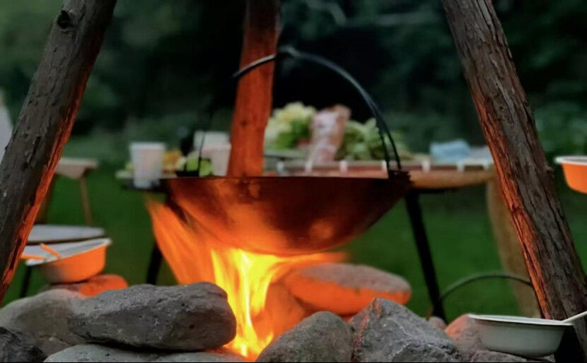 与白云茶舍的清雅不同,少间王圩里民宿的庭院里则飘着另一种烟火气。炭火正旺,五花肉、鸡翅在烤架上烤得滋滋作响,几口硕大吊炉在庭院中央,新鲜的土鸡块炖煮的香气四溢,游客们围炉团坐,举杯畅饮。