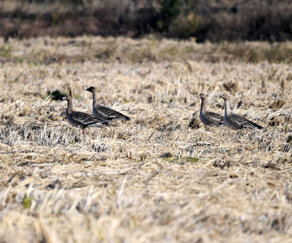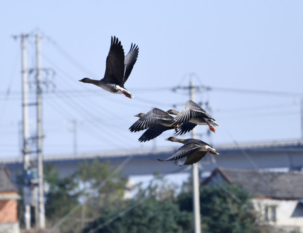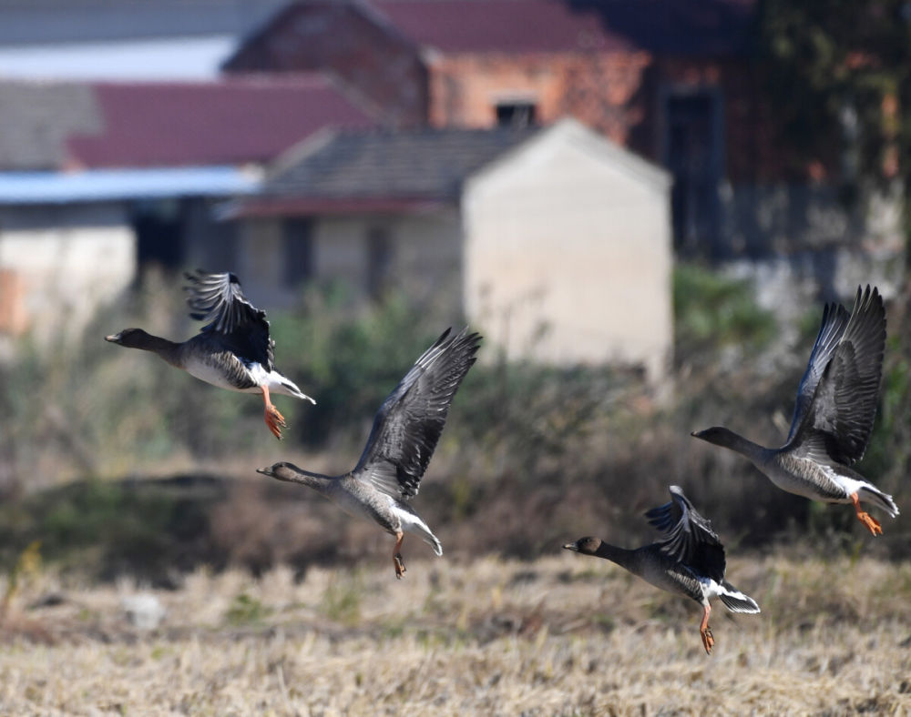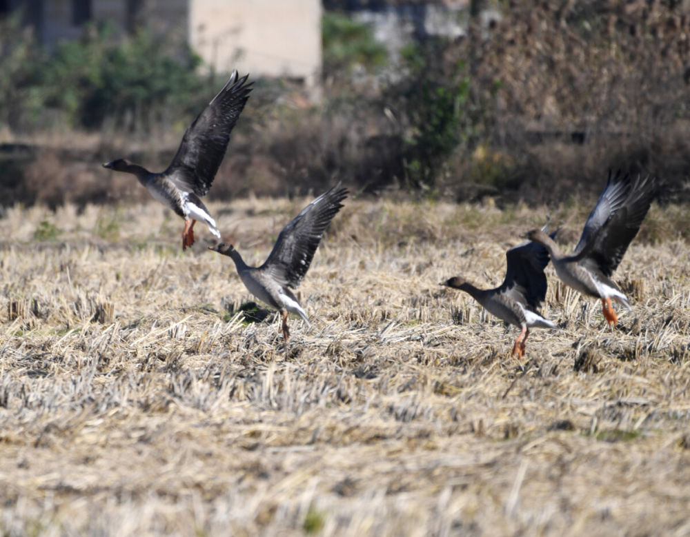 这四只大雁身披灰褐羽衣,颈侧浅淡,喙基处有一抹醒目的白斑——正是典型的豆雁特征。它们在收割后的稻田间从容踱步,时而低头啄食散落的谷粒,时而警觉抬头,时而振翅低飞,在蓝天映衬下的田野上空划出轻柔弧线。它们的到来,为静谧的冬日平添了一份灵动,也成为这片水域生态持续向好的生动见证。