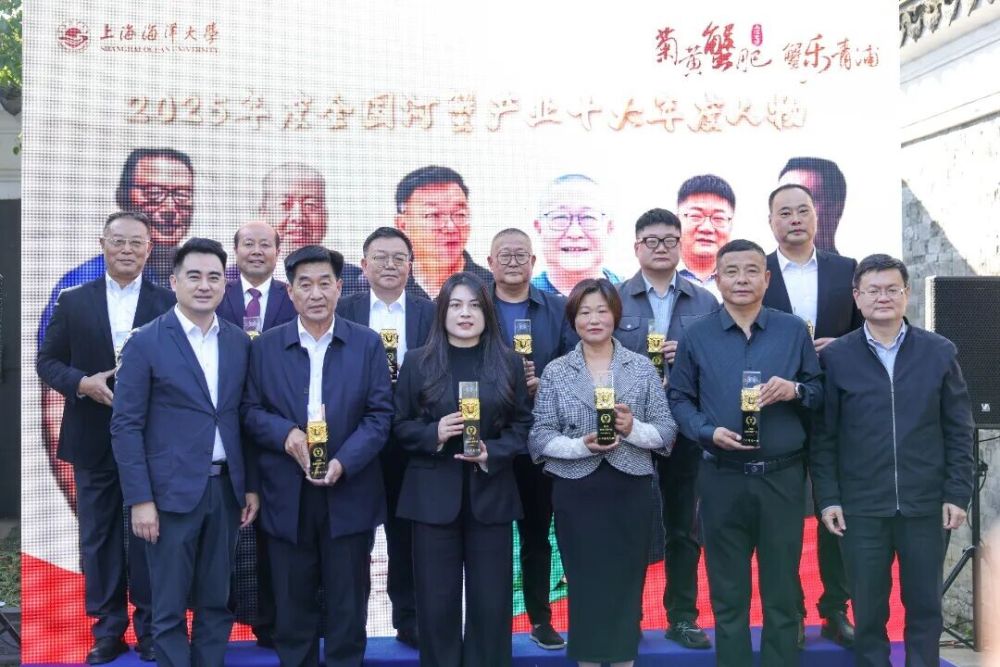 为表彰河蟹从业者贡献,王平、王宏舟共同为2025全国河蟹产业十大年度人物颁发奖杯。