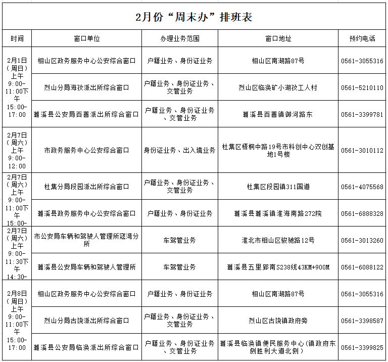 为进一步方便群众办理业务,有效解决群众工作时间“没空办”,休息时间“没处办” 难题,市公安局继续推出政务服务“周末办”“预约办”“错时办”,请有需要的市民朋友,关注全市公安政务服务窗口单位2026年2月“周末办”服务时间(可电话预约),快来了解一下吧!