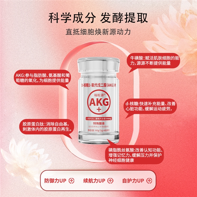 在时光长河中,衰老如同悄然潜入的暗流,不经意间就侵蚀着我们的身体与容颜。在众多抗衰成分中,端粒源AKG凭借其独特的成分脱颖而出。它所含的D-核糖2-氧代戊二酸,是抗衰领域的“明星分子”。其高含量与高活性令人瞩目,每片含量高达500mg,每日只需服用两片,总量便可达1000mg,轻松满足日常人体基础的补充需求,为抗衰之路筑牢根基。