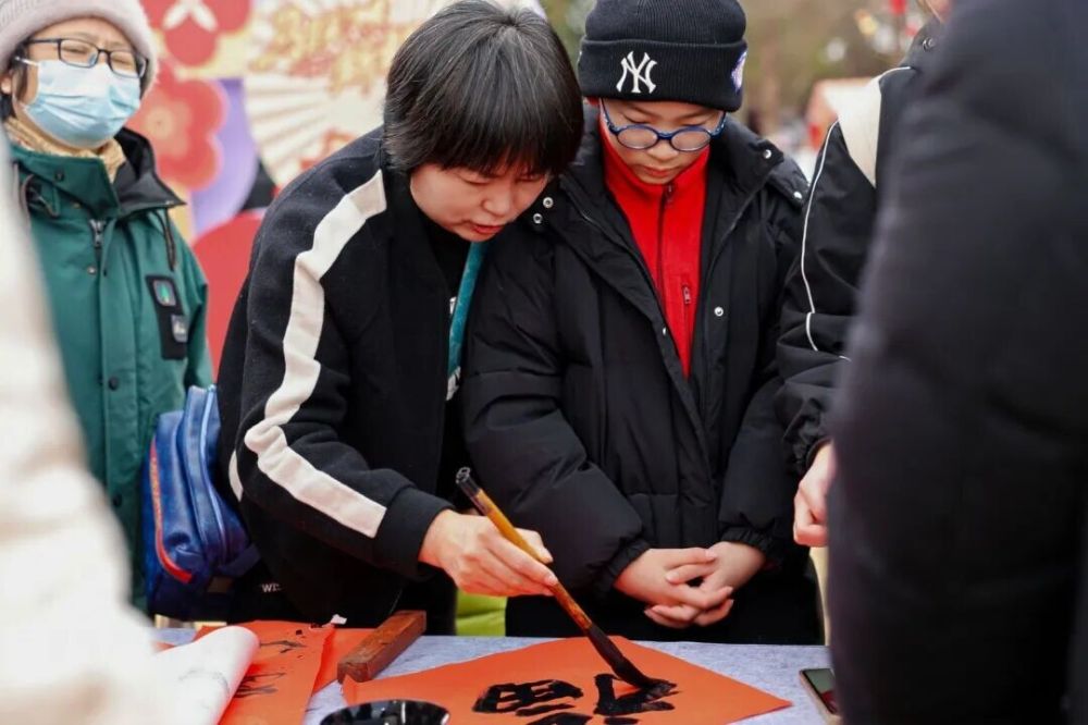 在活动现场的市集区域,年味剪纸、糖画、阿婆茶、竹编等60多个非遗及年货摊位前围满了市民游客。刚出炉的海棠糕冒着热气,焦糖的香气在湿润的空气中弥漫。灯谜长龙下,游客们驻足凝思;书法台前,墨香四溢,一个个“福”字传递着新春的祝愿。