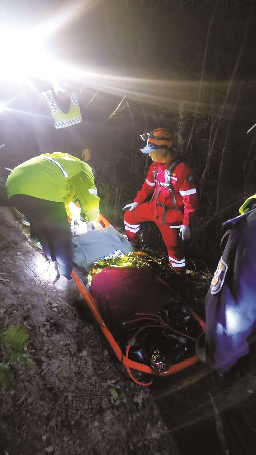 一批救援人员小心翼翼地把被困男子抬到担架上,并通过绳索对担架进行固定。由于山路崎岖难行,只能容纳一人行走,救援队采用一前一后抬担架的方式,20分钟轮换一次班,将被困人员抬到山脚,交由120救护车送到就近医院。