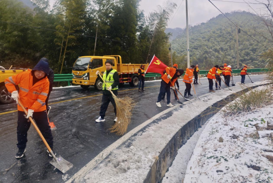 面对冰雪考验,黄山公路部门以高海拔山区为主战场,全天候紧盯路段动态。此次降雪中,G237祁门赤岭段因地势高、气温低,积雪结冰迅速加重。公路部门闻雪即动,第一时间调集抢险力量赶赴现场,并成立党员突击队,联合公安交警、沿线乡镇、交通执法等多部门协同作战,合力开展除冰清雪作业。抢险期间,应急人员还积极协助救援受困车辆,确保司乘人员安全。