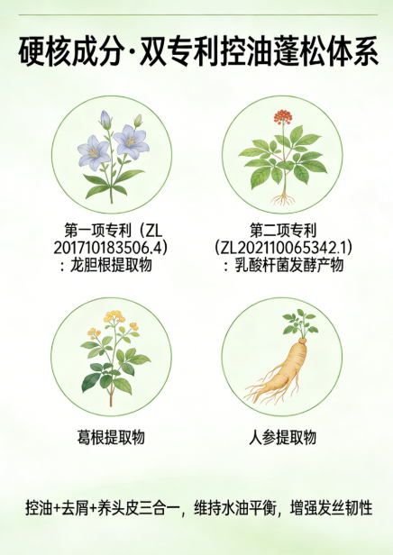 核心控油修护体系依托双专利成分打造,专利号ZL 201710183506.4对应龙胆根提取物、丁二醇、水,主打抗炎舒缓、屏障修护,缓解油性头皮泛红瘙痒,同时锁住头皮水分,避免清洁后紧绷;专利号ZL202110065342.1对应乳酸杆菌发酵产物、乳酸杆菌、α-葡聚糖寡糖、低聚果糖、1,2-己二醇、黄原胶,构建益生菌+益生元微生态体系,调节头皮菌群平衡,从根源抑制油脂过度分泌,实现长效控油不反弹。
