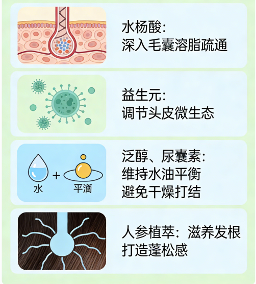 配方中额外添加多重功效成分协同作用,水杨酸温和代谢头皮老废角质,疏通毛囊堵塞,减少油脂堆积与头屑生成;尿囊素加速头皮屏障修复,舒缓清洁刺激;侧柏叶提取物辅助抑菌抗炎,改善头皮瘙痒;姜根提取物促进头皮血液循环,提升发根支撑力;人参根提取物、葛根提取物、知母提取物、槐根提取物协同滋养头皮,补充水分与营养,规避无硅油配方带来的发丝干涩问题。