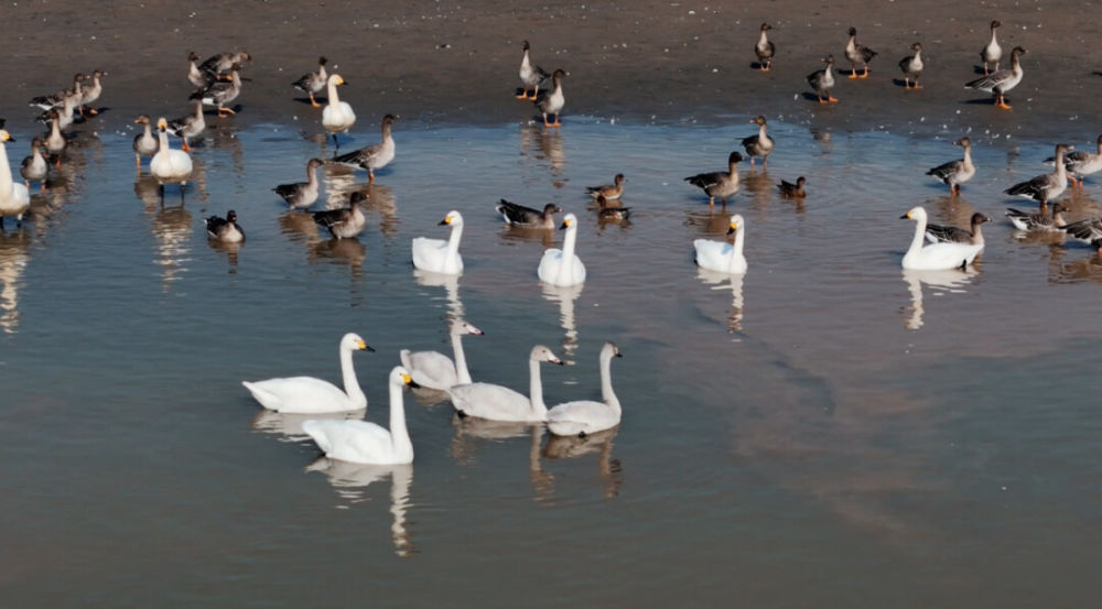 一群身披蓬松白羽的小天鹅悠然踱步,或俯身啄食滩涂饵料,几只斑嘴鸭悄然混入种群自在游弋,暖煦阳光洒在灵动身影上,江水潺潺、鸟鸣啾啾,为这片长江绿洲添满冬日生机。