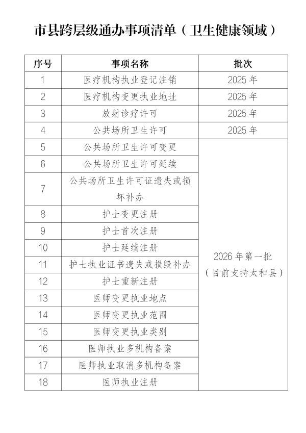 为深入贯彻落实安徽省政务服务“跨域通办”工作部署,持续提升政务服务便利度。在2025年“跨域通办”事项的基础上,阜阳市与太和县试点推出阜阳市2026年首批跨层级通办事项清单。此次市县跨层级通办工作,重点围绕卫生健康领域核心事项推进落地。截至目前涵盖公共场所卫生许可、护士及医师执业注册与变更等18个重点事项。