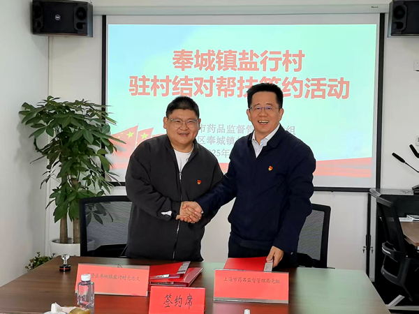 近日,市药品监管局党组与奉贤区奉城镇盐行村党总支签订结对帮扶协议。局党组成员、副局长郭术廷出席会议并签约。