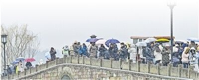 断桥上,市民游客拿着手机相机定格动人雪景。
