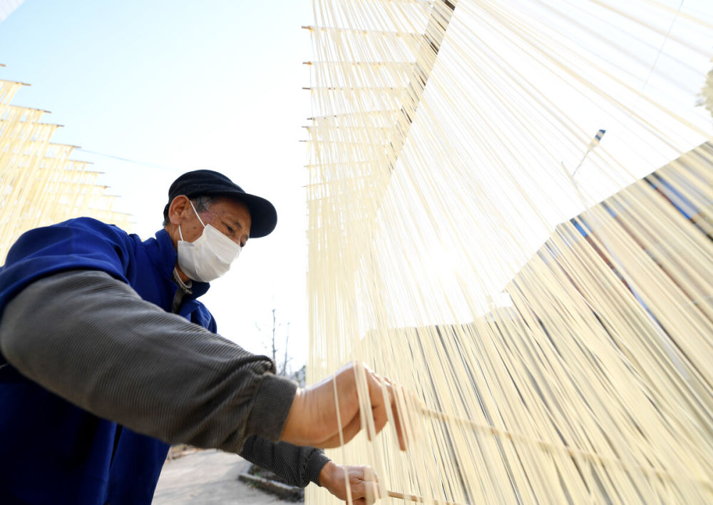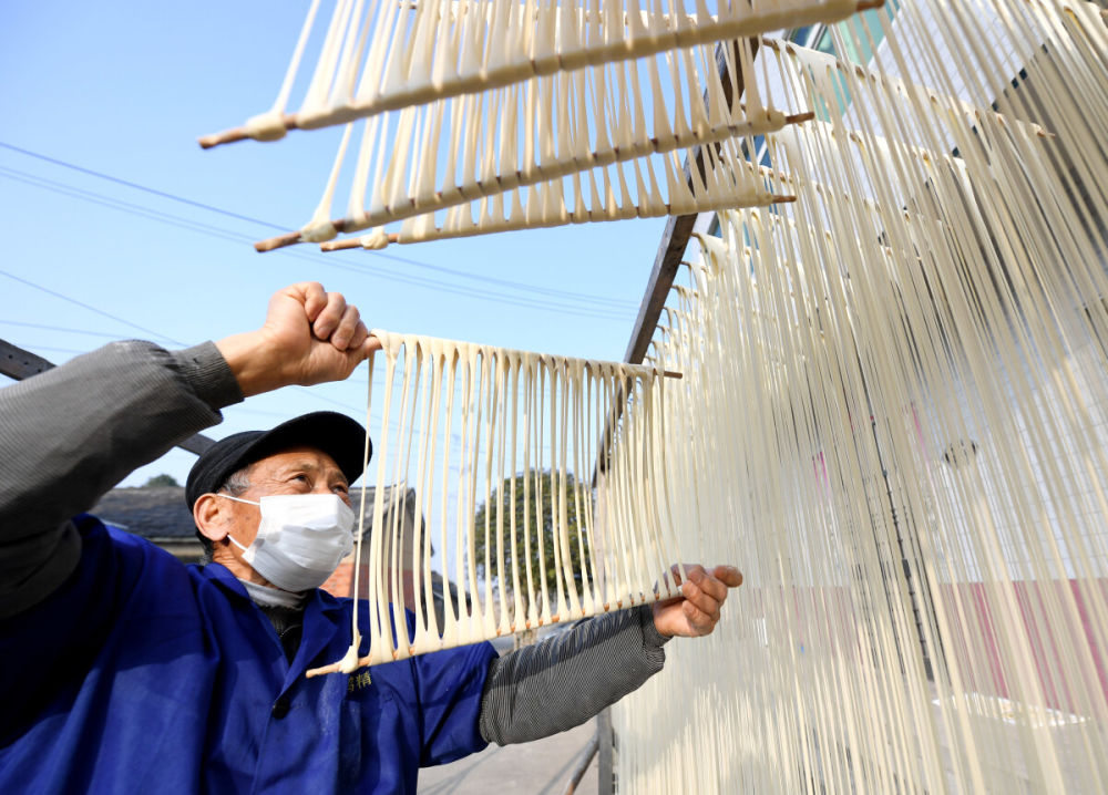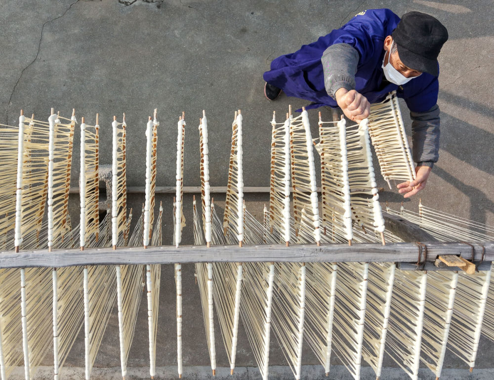 ↑ 12月18日,吴仁严在阳光下将挂面上架、拉伸、晾晒。