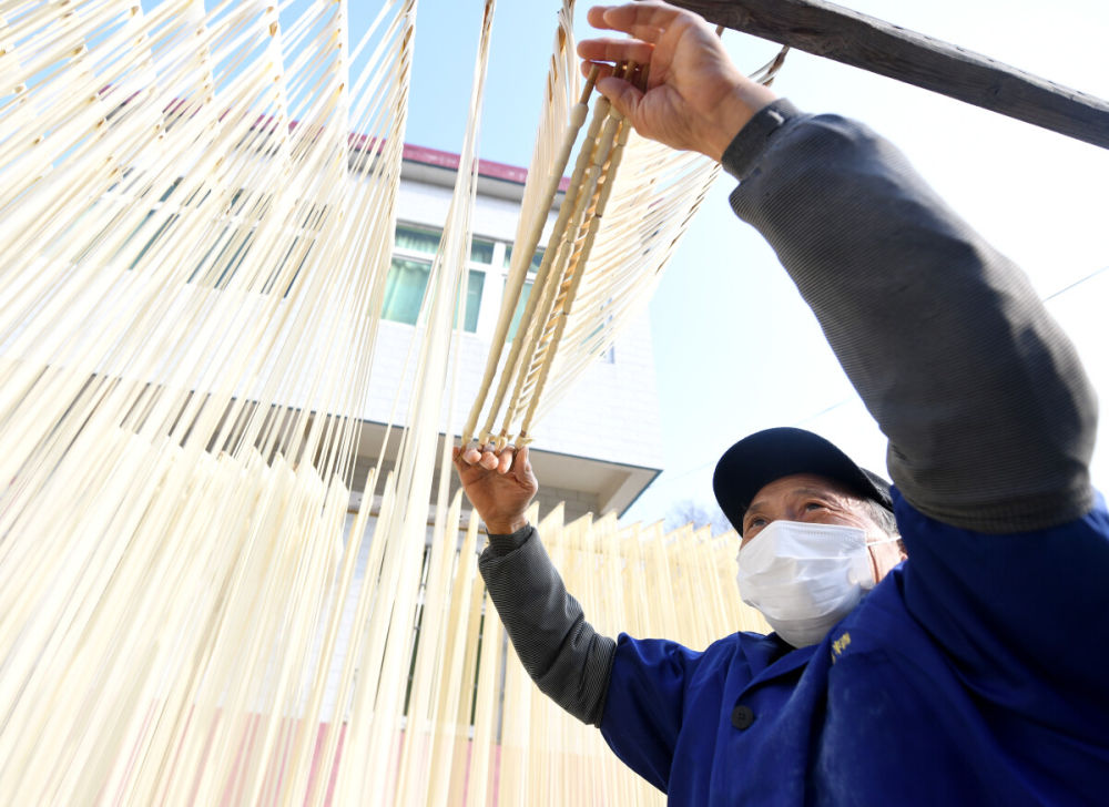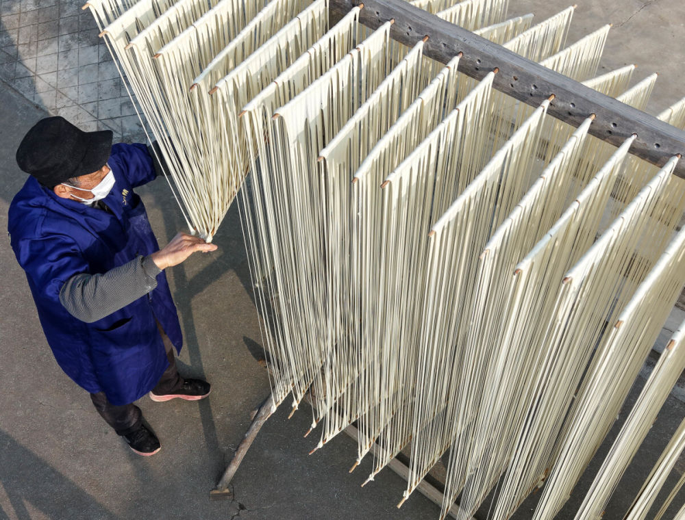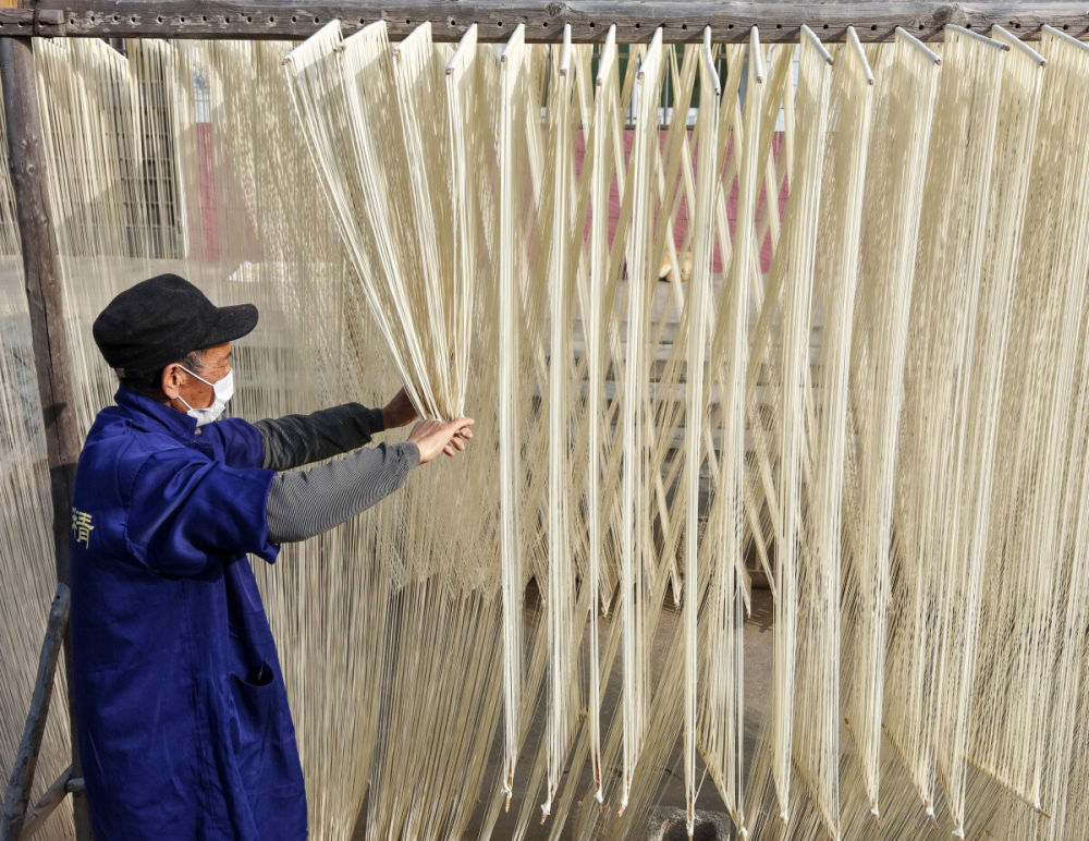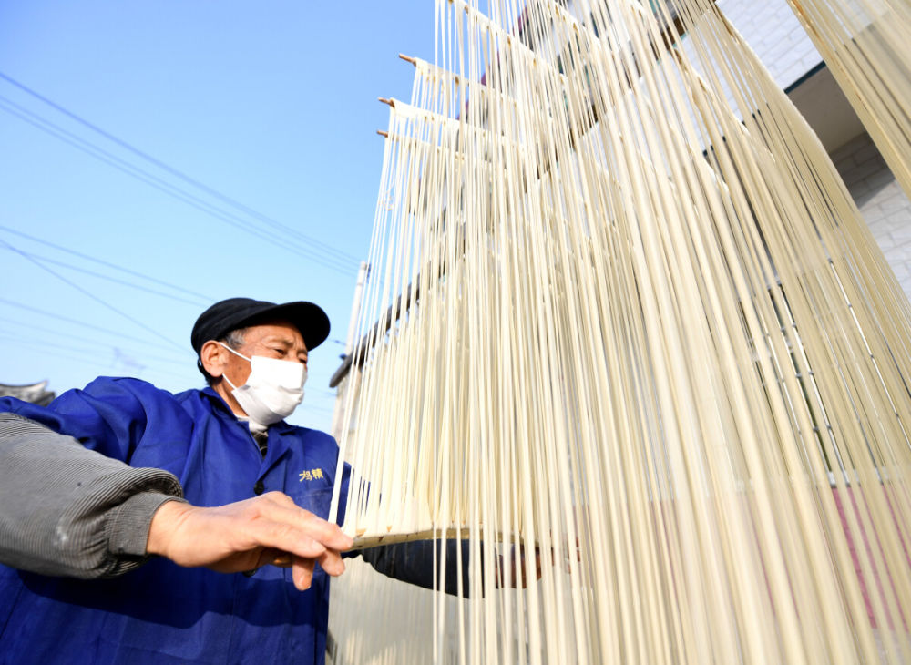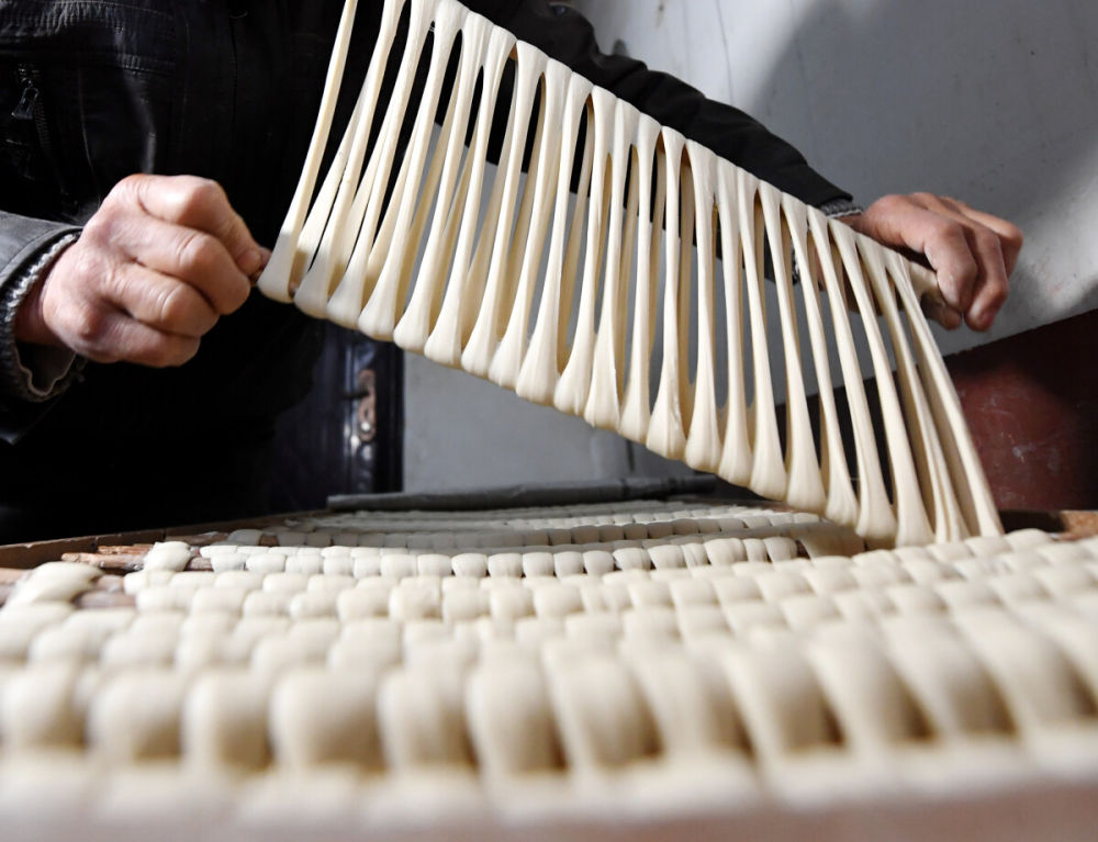 ↑ 12月18日,吴仁严将已经上筷的挂面进行简单拉伸。