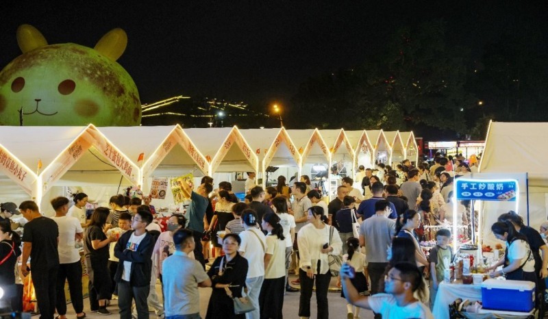 音乐与美食交融,人潮与烟火相伴。罗小罗专场演唱会表演区不远处,长江文化中心“舌尖盛宴·秋食上新”美食夜市也热闹开市,成为靖江市民、广大歌迷以及外地游客休闲消费的“流量担当”。夜市分为一楼和二楼两个区域,一楼市集区共45个摊位,涵盖各色文创产品和特色小吃;二楼美食区设置128张桌子,约800多个座位,当晚几乎座无虚席。“国庆节在长江文化中心,一边听歌一边享受美食一边感受靖江的美丽,心情特别好。”靖江市民张鑫说。