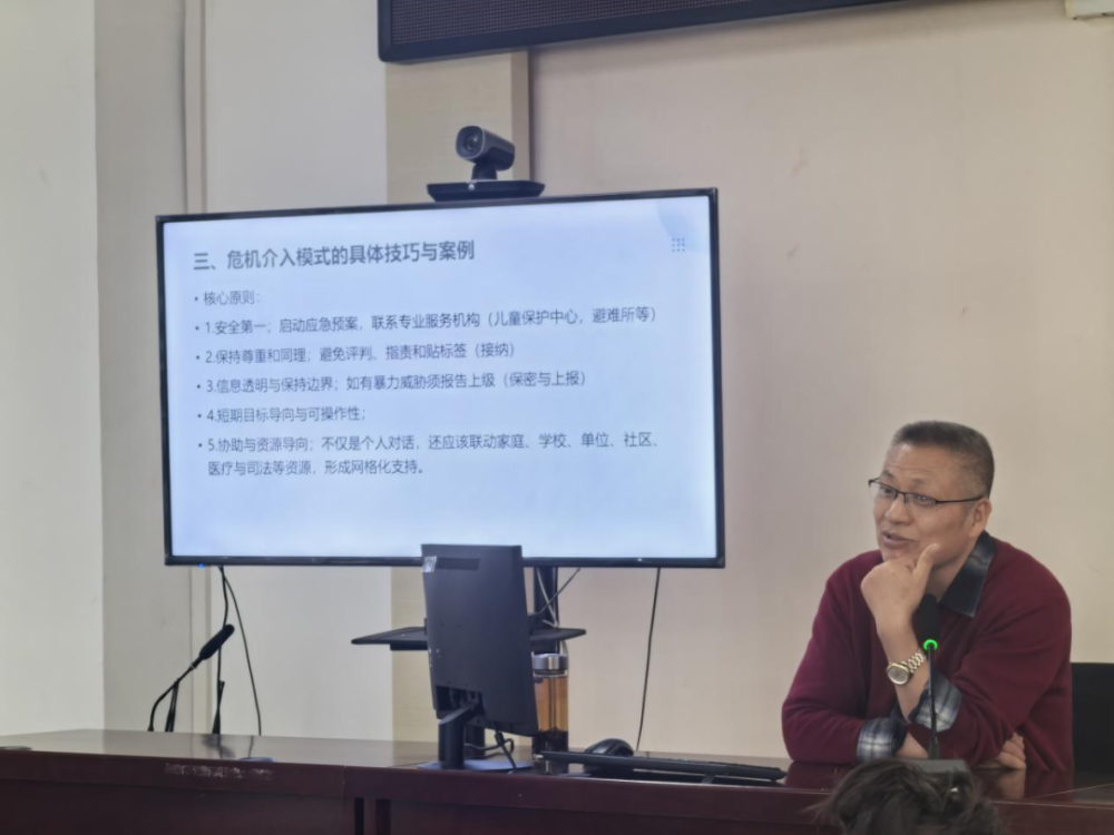 培训中,白教授首先从个人心理需求与社会环境系统互动的视角,深入阐述了社会工作的核心问题,引导大家理解危机背后的多重影响因素。随后,他精辟解析一般个案服务与危机介入模式的关键区别,强调危机介入的即时性、焦点性与行动导向。在核心环节,白教授详细讲解了危机评估、安全计划制定、情绪稳控、资源快速链接等具体技巧,并着重探讨这些模式在社区复杂环境下的应用策略与本土化实践路径。