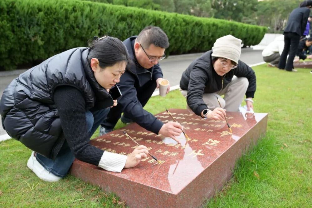 仪式结束后,来自上海市公安局特警总队、吴淞街道、致公党宝山总支部及驻区部队官兵代表,手持毛笔与金漆,为烈士墓碑碑文描金。金色的线条在深色石碑上延伸,让一个个光辉的名字在冬日下愈发熠熠生辉。这场与历史的静默对话将缅怀之情化为具体行动,让烈士的英名愈发清晰、精神深深镌刻于心。
