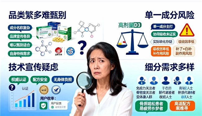 2.市面部分产品仅主打单一成分(如高剂量D3),但协同吸收、实际转化、吸收效率、真实效果往往未被证实,消费者担心“补了=白补”或副作用。