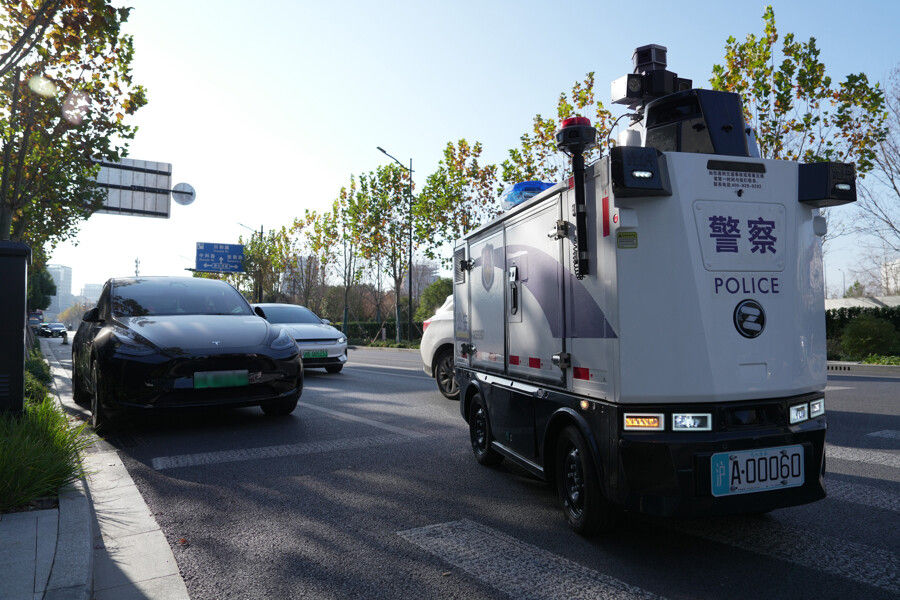 近日,张江人工智能创新小镇内的路中机非隔离护栏被陆续拆除,为防止车辆违停现象回潮,浦东公安分局交管支队在部分路段试点启用警用无人驾驶装备。