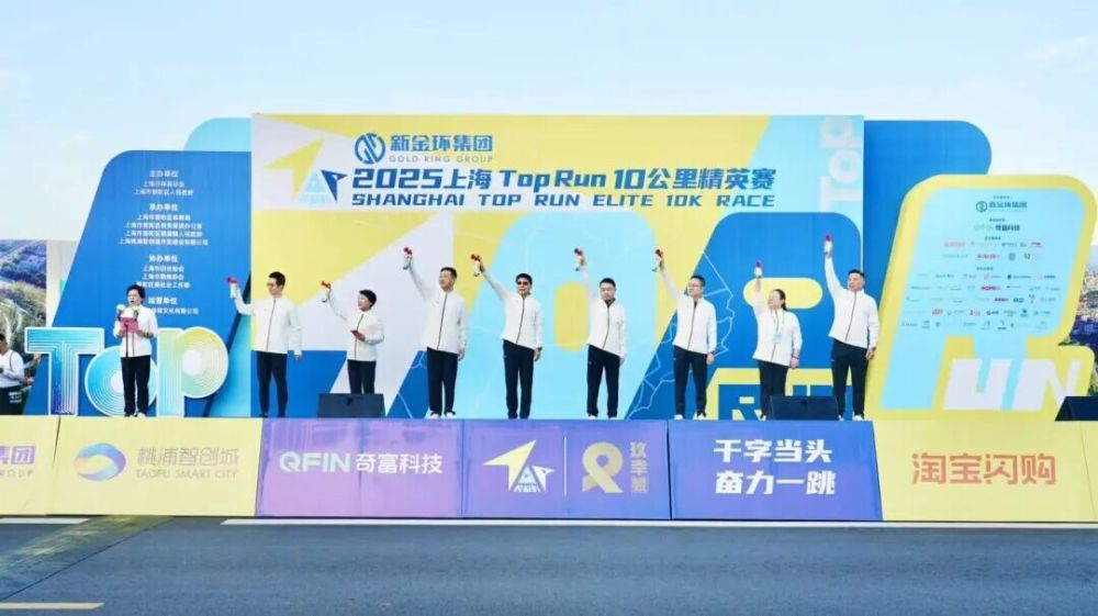 起跑仪式上,区委书记胡广杰,区委副书记、区长赵亮,区人大常委会主任谈上伟,区委副书记赵勇,市体育局一级巡视员宋慧,副区长王珏和新金环集团、奇富科技、李宁体育等企业负责人共同为2025新金环上海TopRun10公里精英赛鸣笛发令。