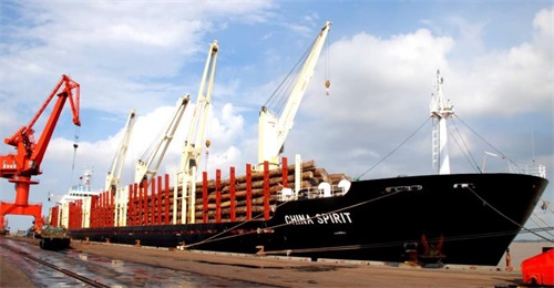 图为盈利港务木材装卸作业