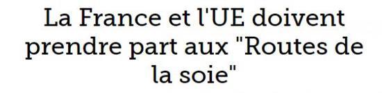 “法国和欧盟必须参与‘一带一路’。”法国《费加罗报》报道说,无论法国是否参与,“一带一路”都是大势所趋,因此“法国最好的选择是参与其中,并尝试发挥主导作用”。