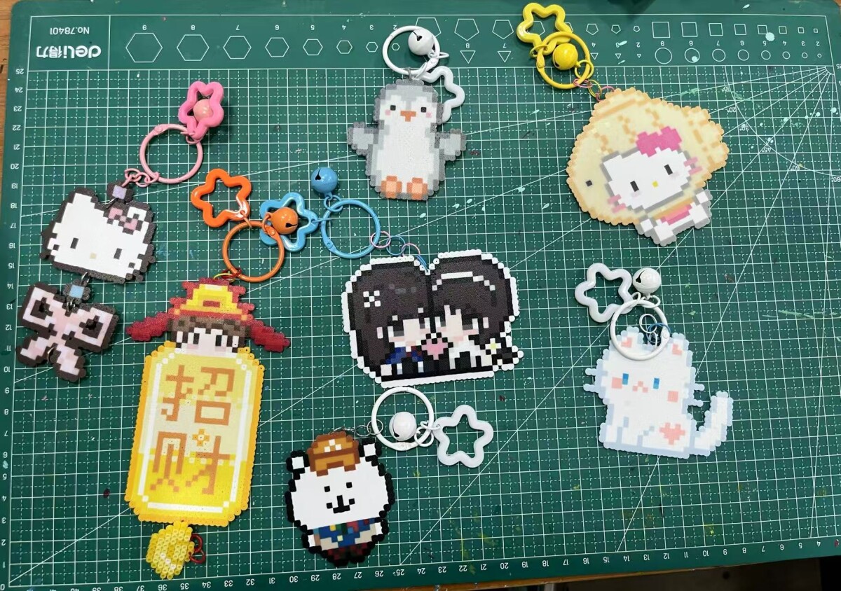 拼豆起源于美国的亲子DIY手工,玩法简单:将彩色豆子排列嵌入专用底板,经熨斗热压后粘连成平面作品。2024年因电视剧《永夜星河》热播成功“破圈”,走入更多年轻人视野。
