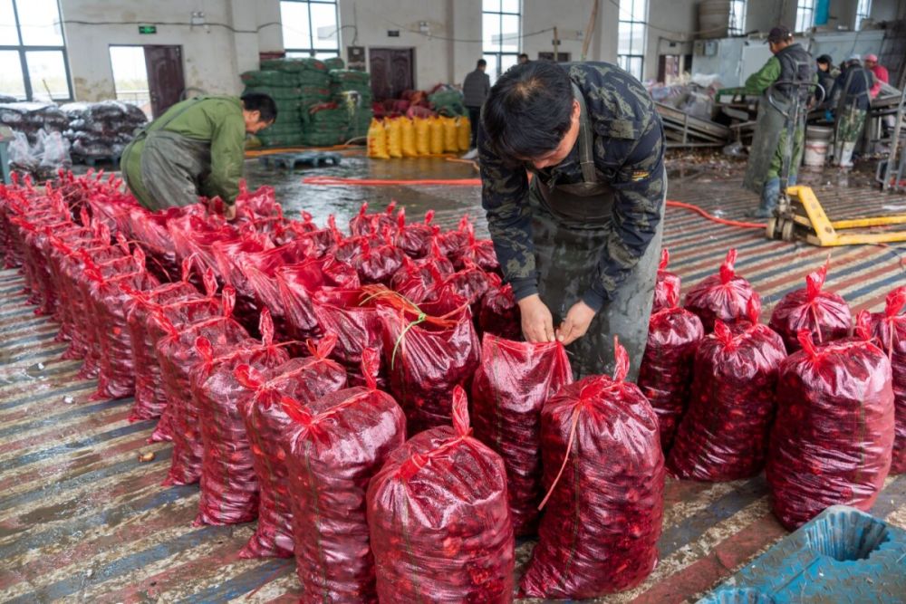 在庐江县西城荸荠专业合作社,两条清洗分拣线正开足马力运转。新挖的荸荠在水流中翻滚,露出紫黑的皮色,工人们眼疾手快,按个头分拣、装袋、封箱,动作一气呵成。合作社销售经理周常根是个土生土长的白湖人,和荸荠打了四十多年交道。自打采收季开始,他的手机就响个不停。“都是来要货的,就认准我们白湖荸荠的脆甜。”