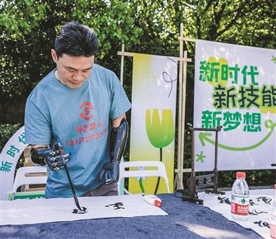 肢残人士佩戴智能仿生手进行书法创作