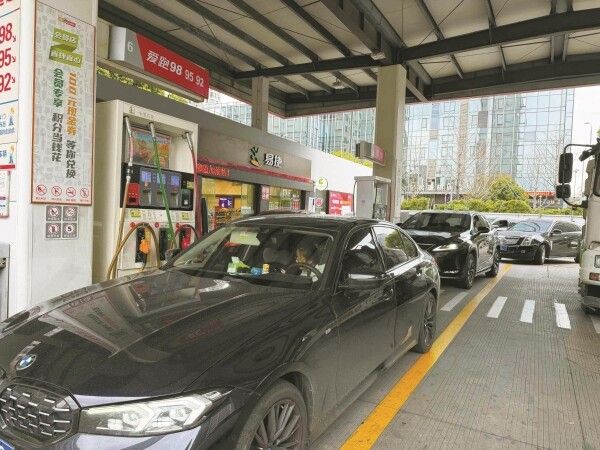 宁波一加油站内,私家车排队加油。