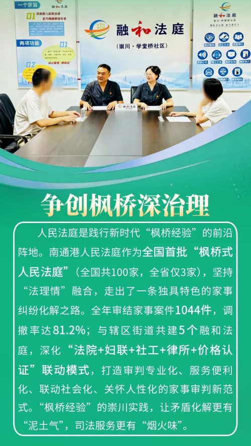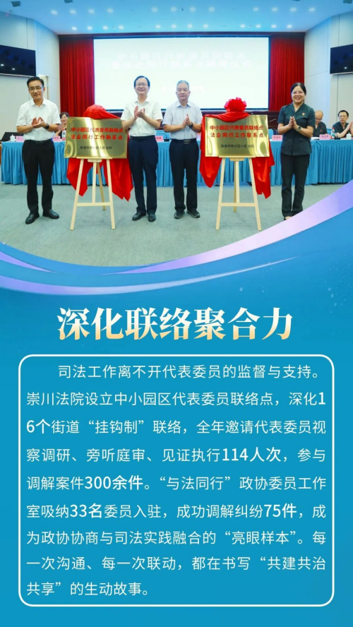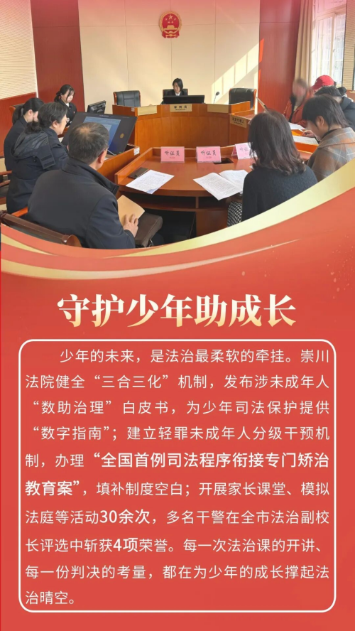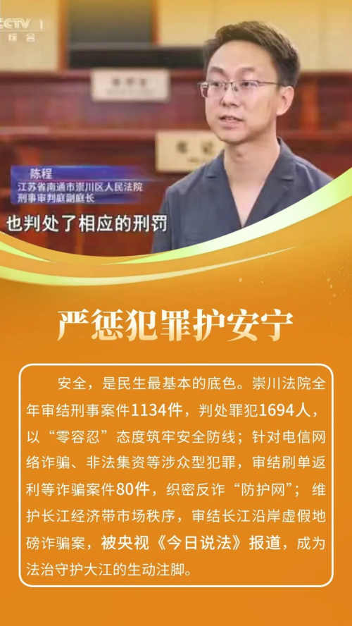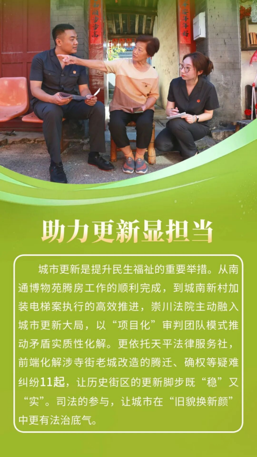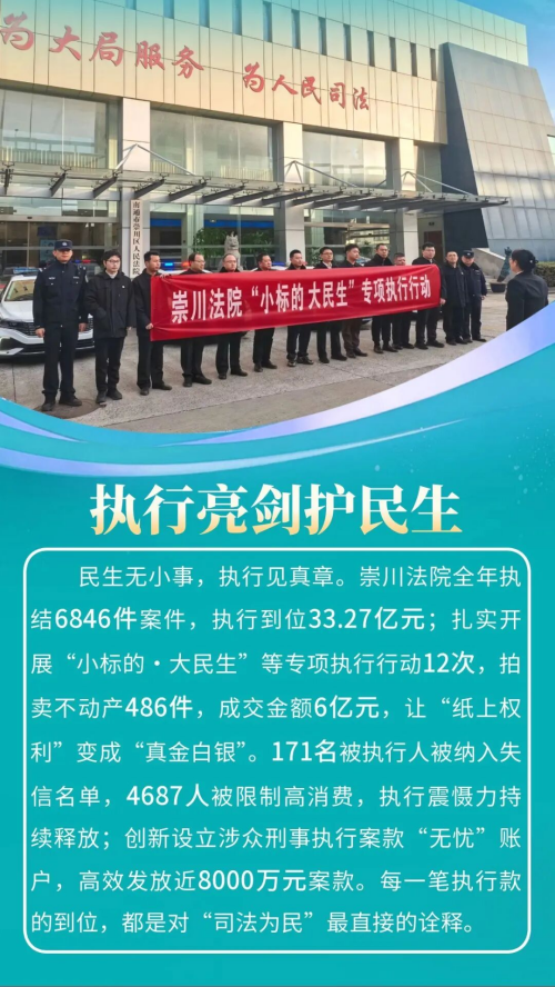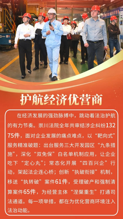 2025年,崇川法院聚焦全区“新四年”行动,细化制定“百项工作计划”,精准对接新兴产业、城市更新、基层治理等领域需求,紧扣“实干担当、提质增效”工作思路,各项工作扎实推进。全年共受理(含旧存)案件34830件,审(执)结29945件,法官人均结案394件,均创历史新高,全院指标达标率100%。人民法庭建设、营商环境优化、审判管理创新等10项工作被上级推广,荣获省级以上集体荣誉8项、个人荣誉30余项。推出适老诉讼服务、执行法官集中接待日等26项“一件事”工作,15个案例入选上级典型。这一年,崇川法院以司法之笔,在护航发展、守护民生的画卷上,写下了温暖而有力的篇章。