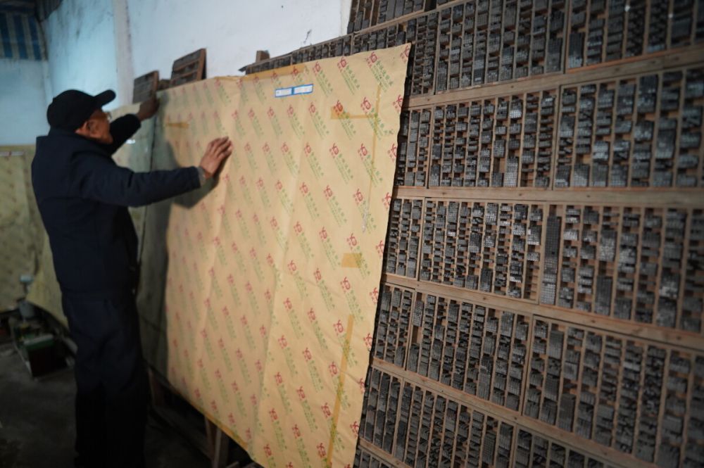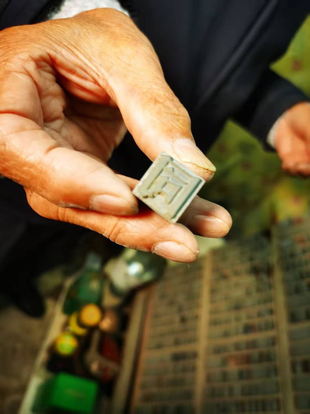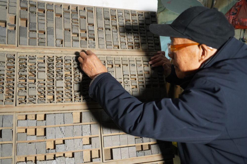 “第一步是拣字。”他拿出一个光滑的木制字托,熟练地在字架间穿梭,将需要的字丁精准取出放入托中。紧接着,他将拣好的字放置在一个铁制的平面字盘里,拼出版样。“有些铅字使用次数多了,就‘老’了,印出来的字迹会模糊不清,这时就要及时更新。”盛诗经一边忙着手里的活一边说道。