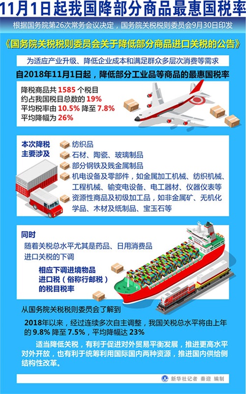 新华社北京9月30日电 根据国务院第26次常务会议决定,国务院关税税则委员会9月30日印发公告,自2018年11月1日起,降低部分商品的最惠国税率。