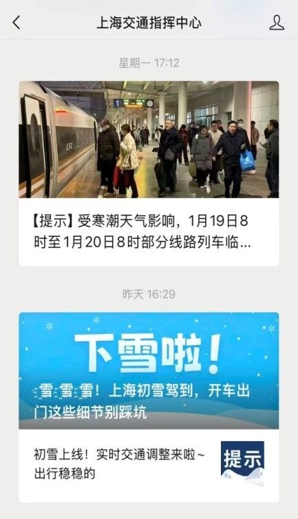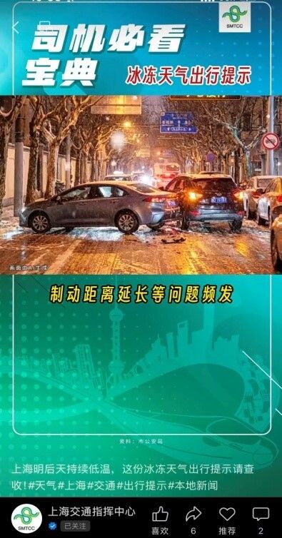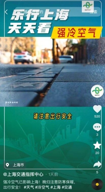 二是针对天气变化,早晚易出现大雾以及寒潮、降雨对开车的市民造成不利影响等情况,指挥中心提前在“上海交通指挥中心”微信公众号、抖音等新媒体平台发布便民信息,开展安全出行提示;20日当天,联络澎湃新闻等网络媒体,在全网进行路况直播,扩大宣传声量和覆盖人群;加强内部信息互通,及时将了解到的最新交通调整,如三岛客运轮渡停航、火车临时停运、高速限速等交通调整信息以及道路保障情况向社会公开。本次寒潮期间,在“上海交通指挥中心”账号累计发布微信公众号图文6篇,抖音视频2条。