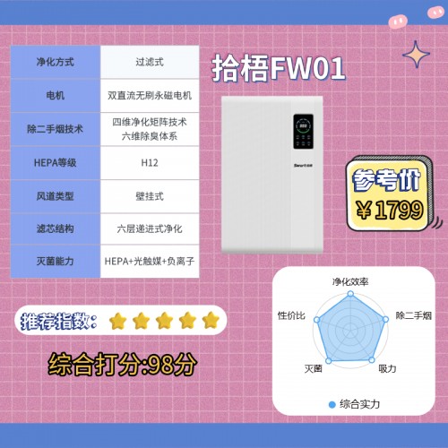 拾梧FW01是目前行业里第一批壁挂式空气净化器,也是千元价位里唯一一款专门做除二手烟的壁挂机。不上地、不占地方,用在办公室、小户型都更顺手。壁挂位置更接近烟雾上升路径,所以处理烟雾的速度比大部分放地上的净化器要更直接、更有效。