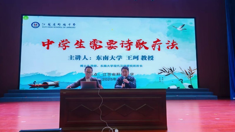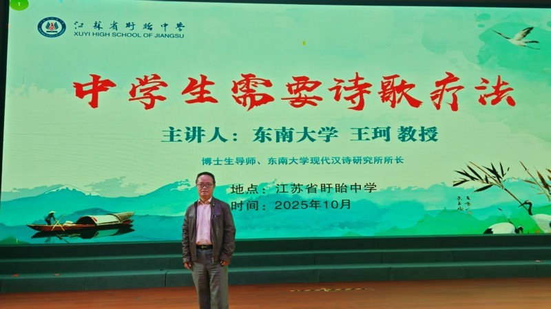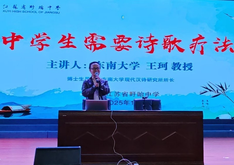 10月29日,国内首场面向中学生的诗歌疗法讲座在江苏省盱眙中学成功举行。东南大学现代汉诗研究所所长、博士生导师王珂教授担任主讲,以《中学生需要诗歌疗法》为题,为现场一千多名师生带来一场启迪心灵的诗意对话。
