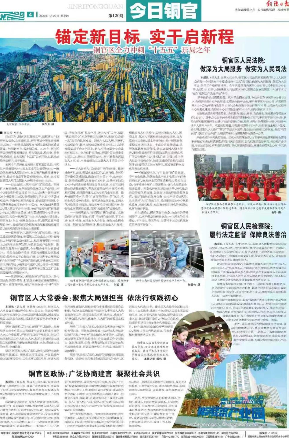 专版全景式呈现铜官区2026年经济社会发展的奋进蓝图,锚定地区生产总值增长6%等核心目标,从筑牢经济底盘、激活产业动能到释放改革活力,从绘就城市画卷、答好民生答卷到守牢安全底线,六大攻坚方向纲举目张。专版同步聚焦区人大常委会、区政协、区法院、区检察院等履职成效,生动展现全区上下干字当头、唯实争先的昂扬风貌,既彰显发展力度,又饱含民生温度,以优异成绩向建市70周年献礼。(通讯员 徐莹娟)