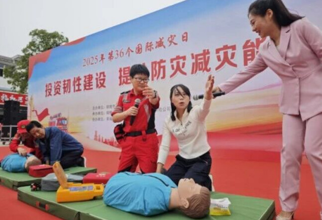 曙光应急救援队现场演示心肺复苏、包扎止血等急救技能,指导居民实操;工作人员示范防毒面具穿戴,邀请居民体验破窗锤使用,传递科学防灾理念。活动设防灾知识问答、抽奖环节,同步开设政策咨询台,详解该区易发性灾害应对策略,宣讲安徽省自然灾害民生保险政策,让“灾害救助+金融保险”保障体系深入人心。居民王大姐说:“学到实用急救知识,还领到应急礼包,这样的活动很实在!”