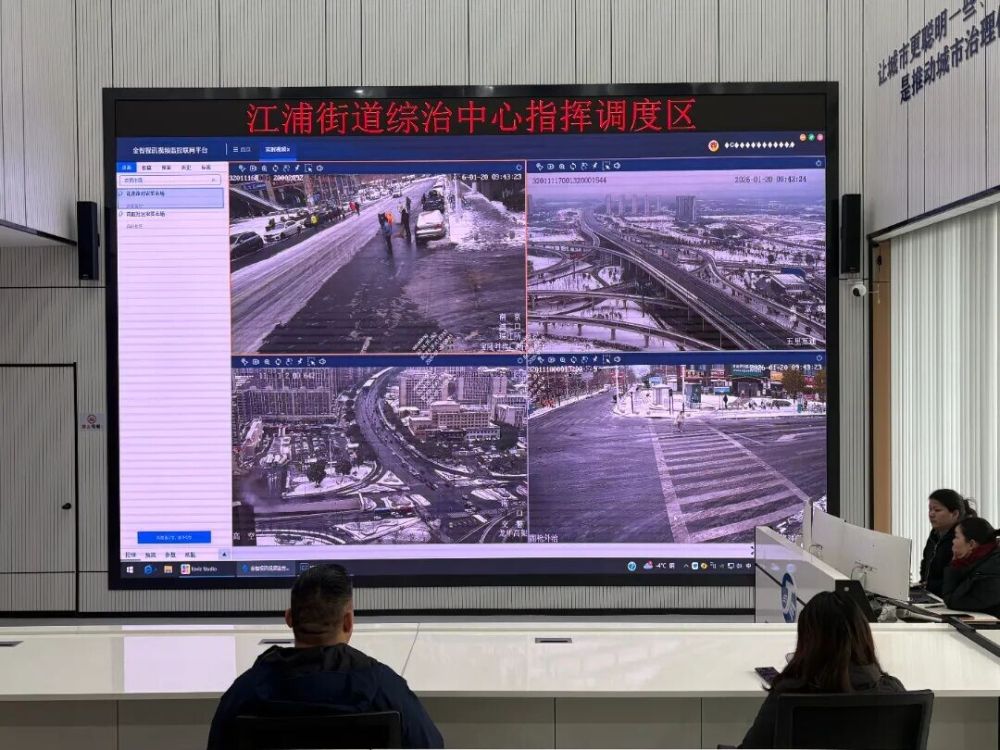 早在风雪来临前,江浦街道就未雨绸缪制定《江浦街道雨雪冰冻天气扫雪防冻应急预案》,备足融雪剂、防滑草垫、除雪车等应急物资。从提前预警、物资储备,到闻雪而动、温情服务,每一个环节都彰显着江浦街道“以人民为中心”的初心。其次依托街道综治中心指挥调度平台,面对雪情等突发状况,充分发挥“一屏统览、一体指挥”功能,通过多部门协同、信息实时共享,提升应急响应与指挥调度的速度与精度,实现了事件精准研判。