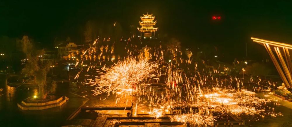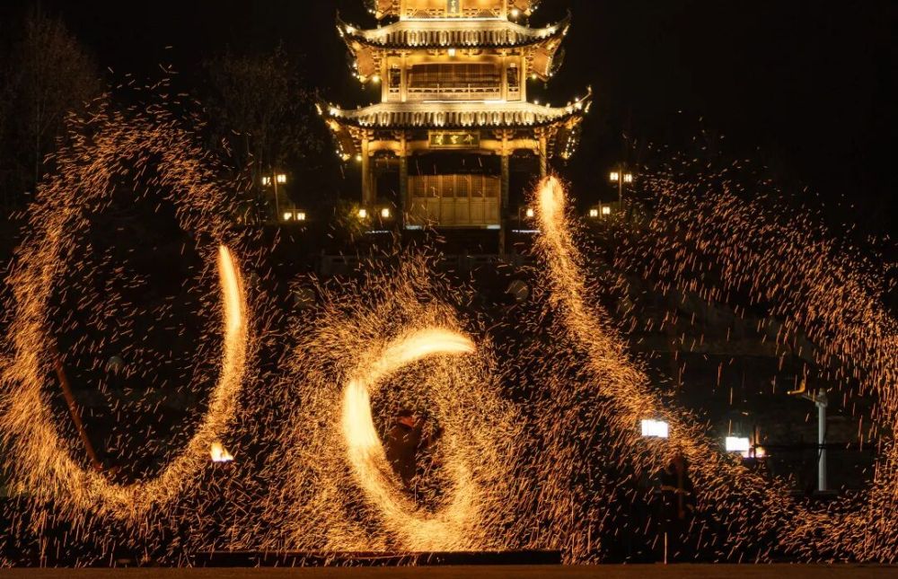 “神秀山月”定制版齐云打铁花、非遗炭花舞、药发木偶、白岳烟花秀等火系非遗演艺,设下火神法阵,让《剑来》中的修真幻想融入现实。
