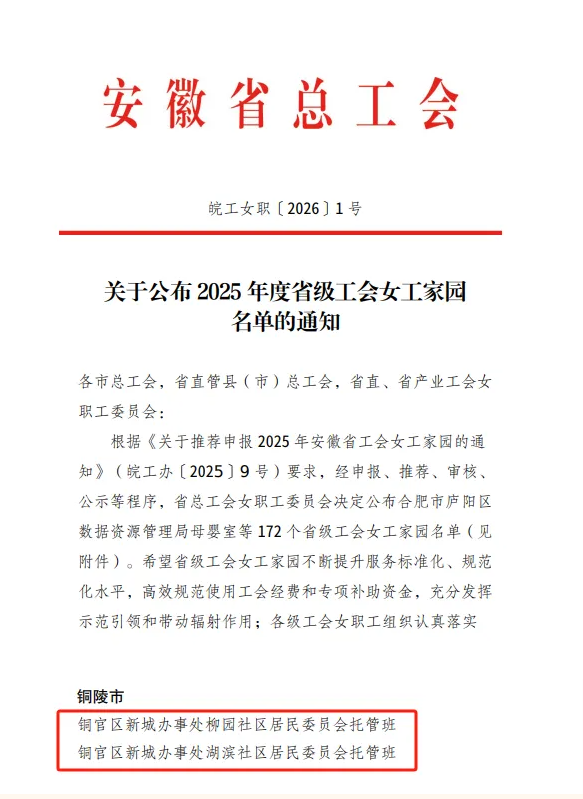 近日,安徽省总工会女职工委员会公布2025年度省级工会女工家园评选结果,铜官区总工会申报的新城办事处柳园社区托管班、湖滨社区托管班获评该称号。