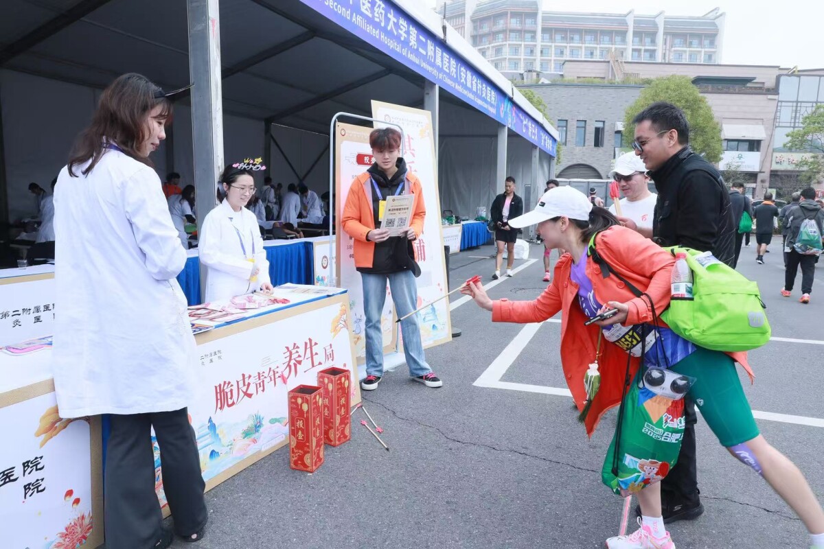 “这是我们第七年服务合马,‘七’待已久,‘灸’等你来不只是口号,更是我们的承诺。”安徽省针灸医院主任医师、副院长孙培养说,“今年,我们进一步充实了团队力量,组织了百余人的医护专家团队,进行了规范化的培训,准备了三万根针灸针、两百个火罐,提供推拿、针灸等恢复性治疗服务。同时,升级了去年备受好评的中医集市,通过‘望闻问切铺’‘特色疗法铺’‘药食同源铺’等多个铺子,开展义诊、AI舌诊体验、护理操作体验、香囊制作、草本酸梅汤品尝等丰富多彩的中医药体验活动,力争为广大跑者提供优质、温馨、专业的医疗恢复服务。”
