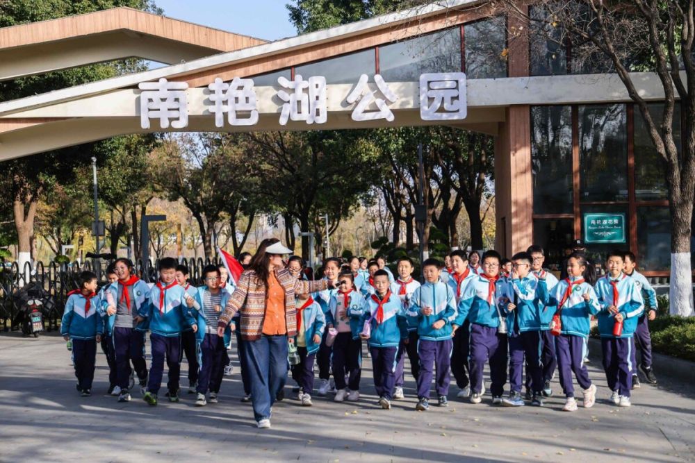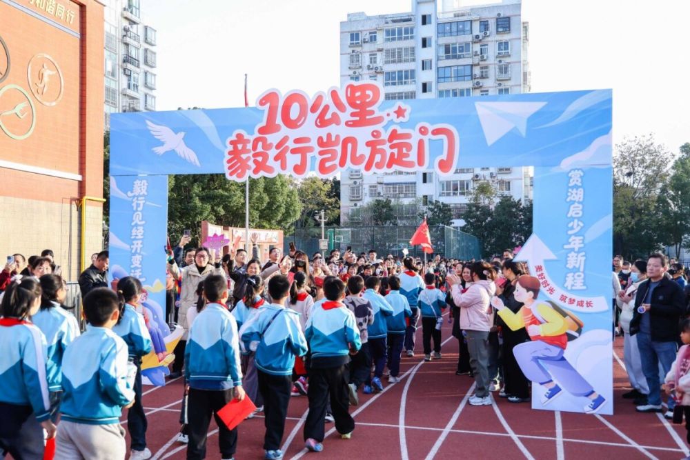 下午1点,校党支部亓副书记为各五年级中队授中队旗,象征着将责任与担当的种子传递给新一代。在党员教师、家长志愿者的全程陪伴下,少先队员们踏上10公里征途。丹霞路旁,党员志愿者向少先队员讲解经开区的发展变迁,让大家在感受社区烟火暖意的同时,厚植“爱家乡、知家乡”的情怀;南艳湖畔,党员教师带队开展环保教育,引导少先队员们观察生态,将生态文明理念根植心中。累了时,党员教师主动帮扶体力不支的少先队员,同学间也相互搀扶;补给站里,党员志愿者协助家长递上水和面包。3个多小时后,当少先队员们带着疲惫返回校园,全体家长共同在凯旋门旁列队,热烈的掌声与欢呼,成了对少先队员们毅力的最高肯定。