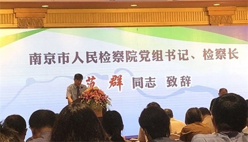 南京市检察院党组书记、检察长范群在致辞中从主动围绕大局、注重系统思维、全面履行职能等三个方面介绍了南京市检察机关开展长江生态环境保护的有关情况和做法。