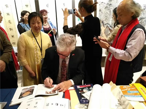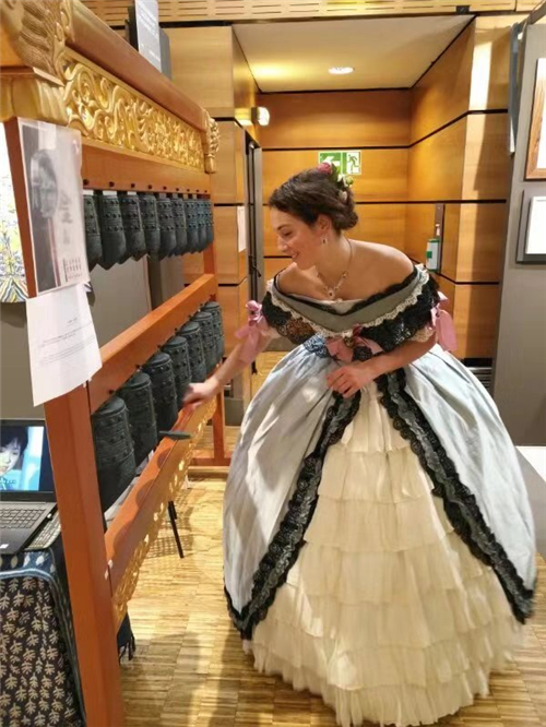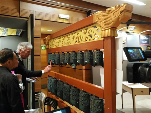 在活动现场,法国收藏家协会主席专程来到中国展区,饶有兴趣地了解编钟制作工艺,聆听编钟乐曲,并给参展人金磊女士亲切题词:期待下一场音乐会的演奏,向激情的艺术家致敬!致我的友谊。佛朗索瓦-高立昂。
